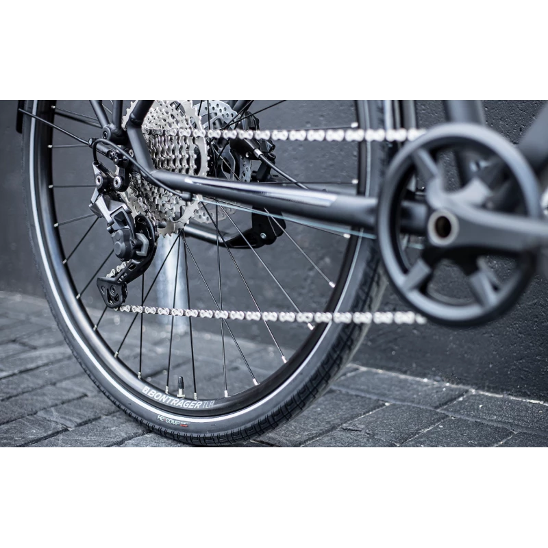 Un cadre aluminium robuste, une fourche télescopique avec blocage pour le confort et une transmission monoplateau 10 vitesses Shimano simple qui se débarrasse du dérailleur avant pour simplifier l’utilisation. Mais ne vous inquiétez pas : sa cassette à large plage de rapports 11-46 vous donne tous les rapports dont vous avez besoin pour gravir les côtes et foncer sur les tronçons plats. Il possède aussi un moyeu dynamo Shimano qui alimente l’éclairage avant et les feux arrière, des freins à disque, des poignées ergonomiques, des garde-boue, un porte-bagage arrière compatible MIK et une potence Blendr qui simplifie l’intégration des accessoires.